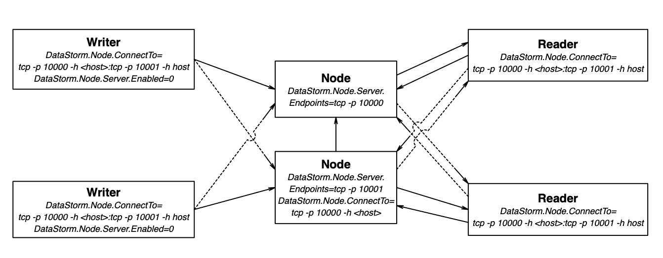 A DataStorm node connects to other nodes to exchange data and to discover other nodes. Discovery can either use UDP multicast or TCP. Data exchange is only performed through TCP connections between nodes. The endpoint for both TCP and multicast are configurable with the DataStorm.Node.Server.Endpoints and DataStorm.Node.Multicast.Endpoints properties. We'll discuss here the different network deployments which are possible with DataStorm.